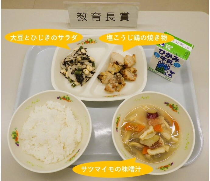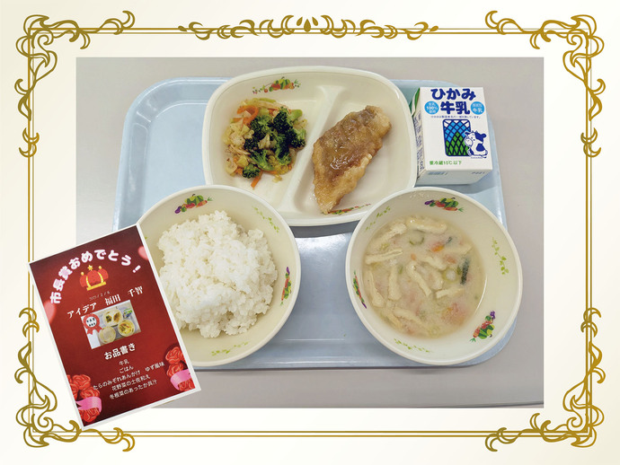 市長賞のメニューは、ごはん・牛乳・たらのみぞれあんかけゆず風味・花野菜の土佐和え・冬根菜のあったか呉汁(ごじる)。季節の食材をたくさん取り入れた栄養たっぷりのメニューです。