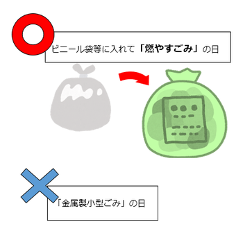 指定袋に入れて「燃やすごみ」の日に出してください。