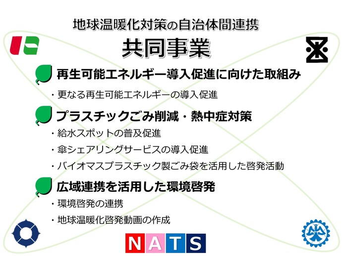 NATSは、府県の枠組みを超えた新たな都市間ネットワークを形成し、市民サービスの向上や各市が抱える課題の解決に向け、連携して取り組んでいくことをめざしており、今般、地球温暖化対策の自治体間連携に関する基本協定を締結しました。