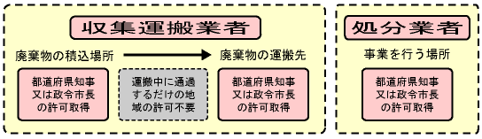 (注)廃棄物処理法の改正によって、平成23年4月1日から積替え保管を含まない収集運搬については、都道府県知事の許可で当該都道府県下の政令市を含む収集運搬を行うことができるようになりました。