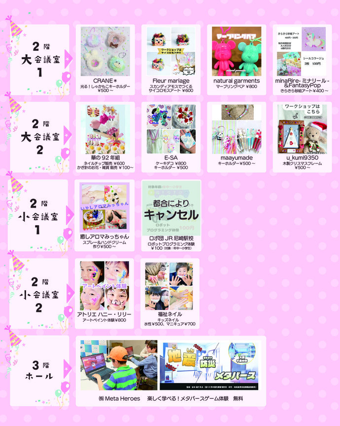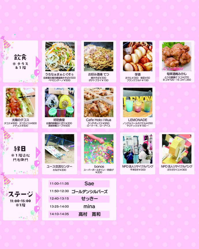 飲食ブースや小さなお子さんでも楽しめる縁日ブース、お友達と楽しめるかわいいワークショップブースなどおいしい!たのしい!が盛りだくさん。