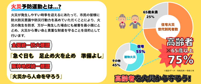 火災が発生しやすい時季を迎えるにあたり、火災予防思想の一層の普及を図ることで、高齢者等を中心とする死者の発生を減少させるとともに、財産の損失を防ぐことを目的としています。