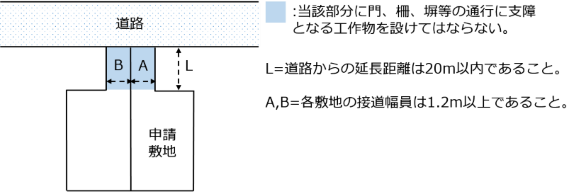1. 敷地が道路に1.2メートル以上接していること 2. 次のいずれかに該当すること ア 自敷地の通路と、それに隣接する隣地の通路の幅員の合計が2メートル以上あること イ 自敷地の通路と、それと離れた位置の隣地の通路(幅員60センチメートル以上のもの)の幅員の合計が2メートル以上あること 3. 道路までの自敷地の通路の長さが20メートル以下であること 4. 敷地面積が 500平方メートル以下であること