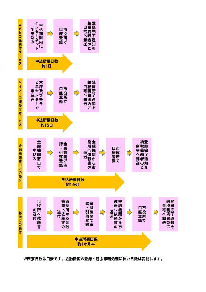 ⇒口座振替の申込は、納期未到来の税金のみお申込みいただけます。お申込みには、所定の日数が必要となります。各申込方法の説明欄に記載されている申込所要日数をご覧いただき、納期限までに余裕をもってお申込みください。