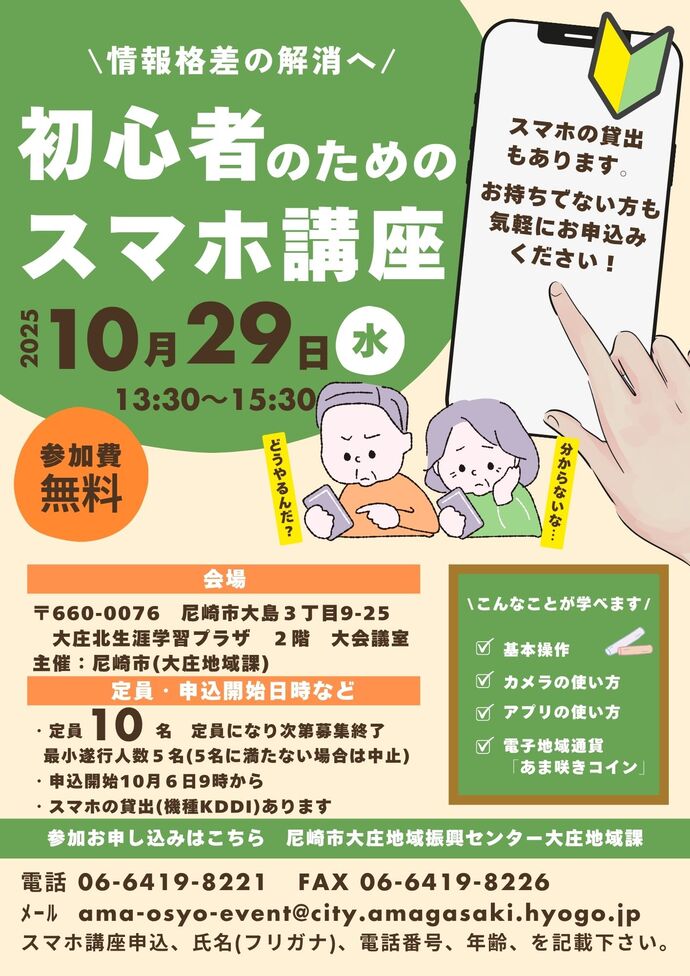 2025年10月6日(月曜日)から、電話06--6419-8221、FAX06-6419-8226、メールama-osyo-event@city.amagasaki.hyogo.jp、で受付。