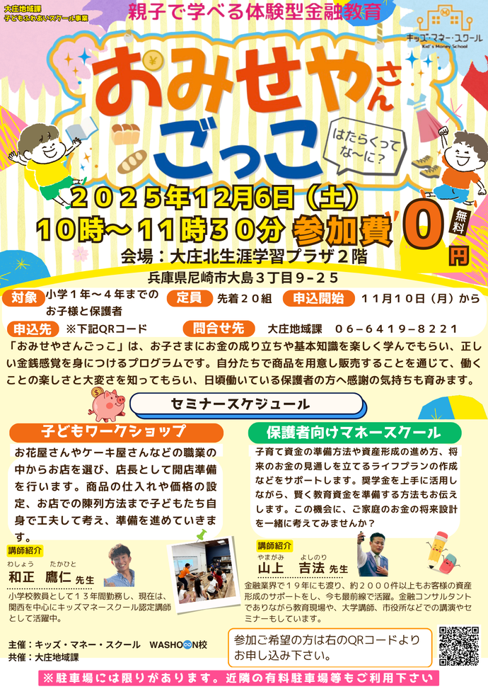 - 保護者向けミニマネー講座: お子さんたちが開店準備をしている間に、おこづかいの考え方、家庭のマネープランなどについての役立つ情報をお話します。