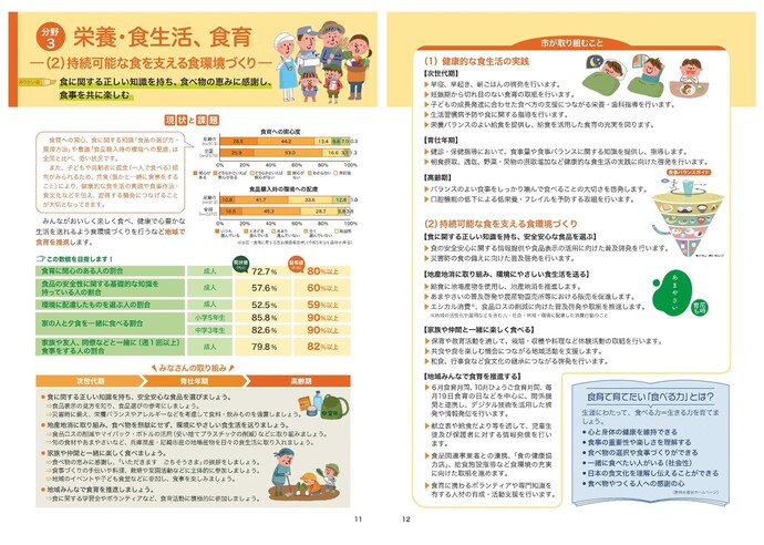 平成27年に「第2次尼崎市食育推進計画(6か年)」を策定し、”実践”をコンセプトに多岐にわたる幅広い分野の関係者が、連携・協働して生きる上での基礎となる「食」に取り組みました。令和4年度のアンケート等による評価結果では、食育への関心、食育に関する知識や意識は全国と比べ低く、また、若い世代に「毎日朝食を食べる人、バランスのよい食事をしている人」が少ない等の課題がみられました。