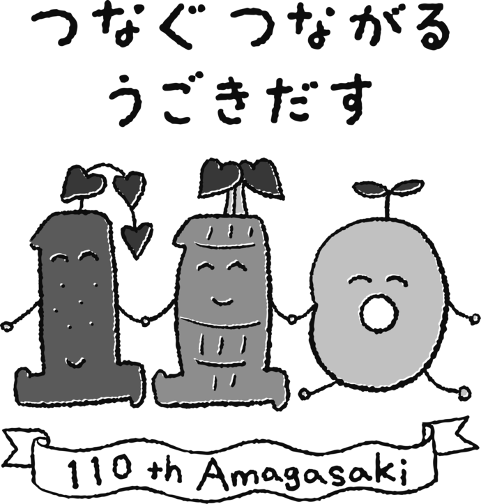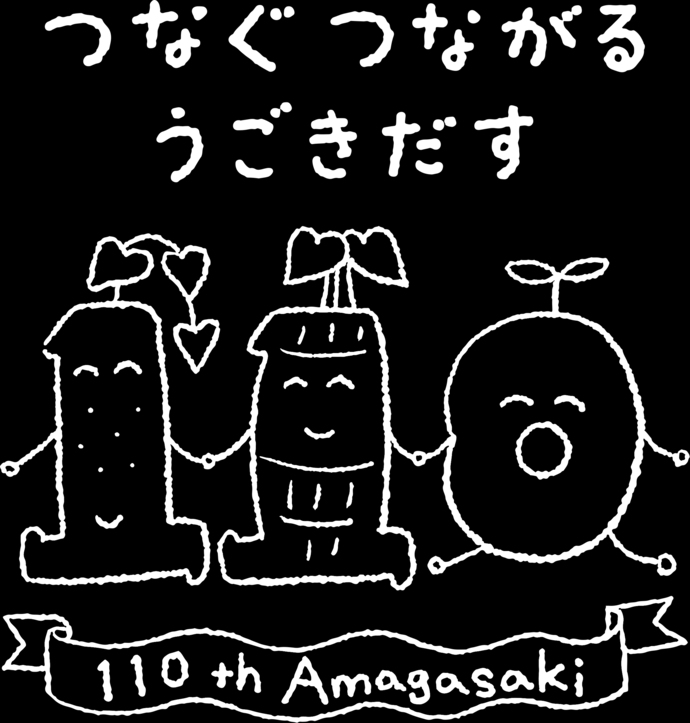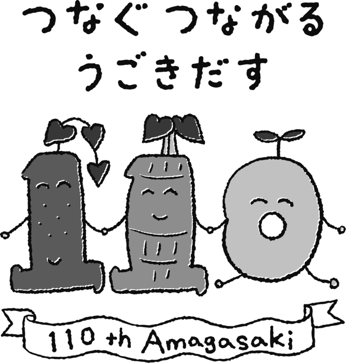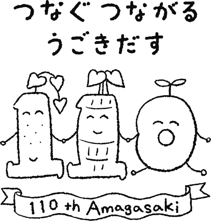 尼崎の伝統野菜、「尼いも」「田能の里芋」「一寸そら豆」が、笑顔で、仲良く手をつないで歩き出すイメージで作成しました。この3種の野菜たちは、尼崎市制110年より、もっともっと昔から育てられ、続いてきた歴史があります。町の伝統野菜を育て続けることと、食することは、人々の心も、町の経済もうるおし、幸せにつながっていくと思います。尼崎市も、ずっとずっと人々に愛され、幸せな気持ち溢れる町であり続けることを願います!